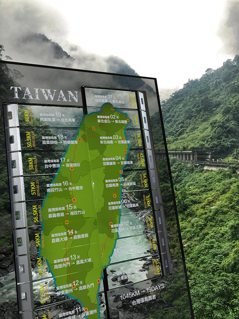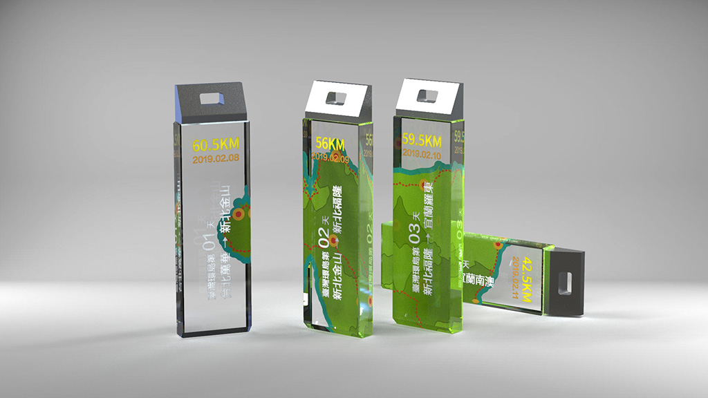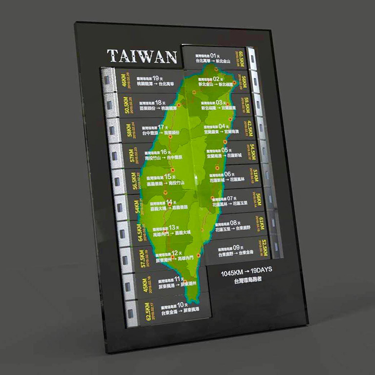 2019年2月8日,台灣環島跑者聯盟舉辦了19天環台路跑活動,總里程1045公里,平均每天要跑55公里以上的超馬,才有可能完成這項壯舉。為了向這些環台的勇士們獻上最高的敬意,我們特別設計了19面可以拼起來的完賽獎牌。